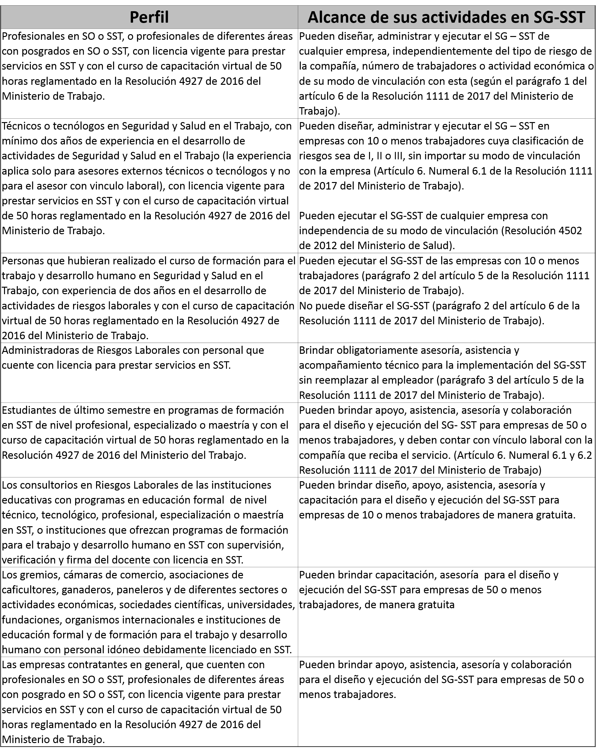 Las empresas pequeñas pueden contratar personal sin licencia para el diseño, administración y ejecución del Sistema, pero no cualquier persona, sino que estén en el último semestre de la carrera profesional en Seguridad y Salud en el Trabajo, o terminando especialización en Seguridad y Salud en el Trabajo, o personas que tengan el curso virtual de 50 horas y aunque no tengan estudios acrediten experiencia de mínimo dos años en Seguridad y Salud en el Trabajo en empresas de menos de 10 trabajadores. Esas personas tienen un alcance limitado porque solo podrían asesorar el diseño en empresas con riesgo de 1 a 3 o de 10 o menos trabajadores.